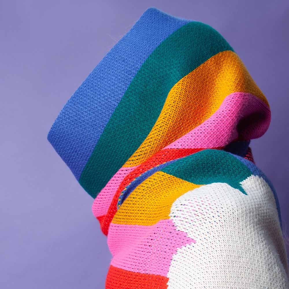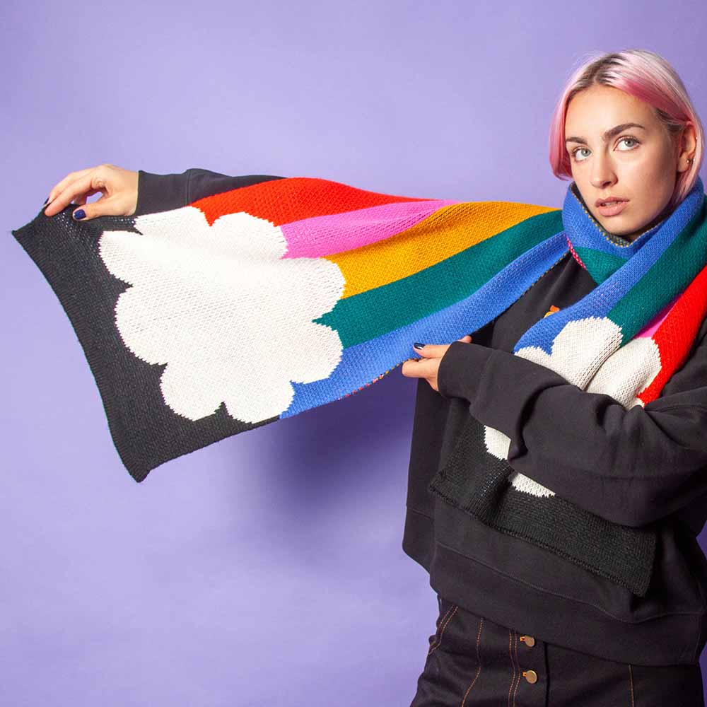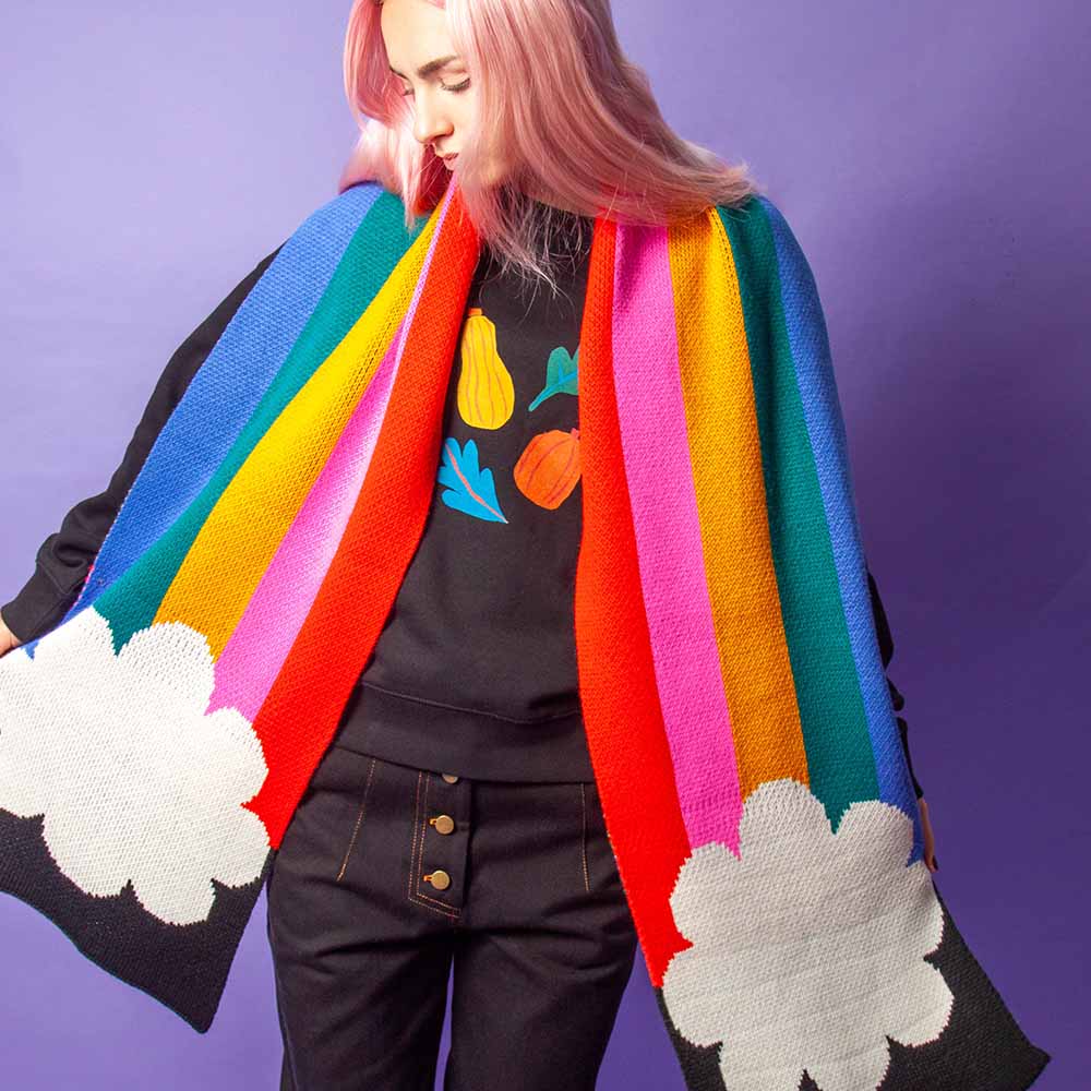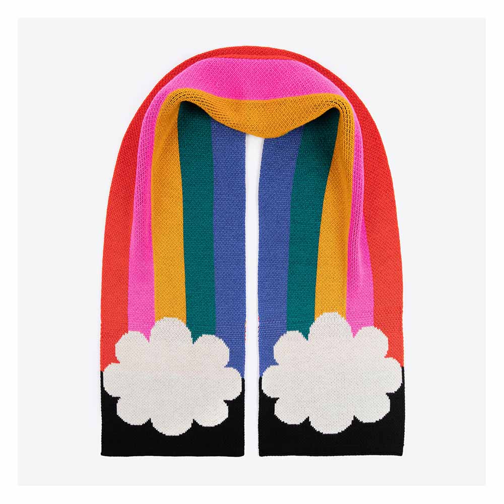 A stunning collaboration with iconic London brand Tatty Devine, cocoon yourself in this happy and hopeful design. The large rainbow scarf features five vertical stripes in this year’s iconic shades. Running into graphic clouds, this cheerful piece takes its shape when draped around the neck and allows you to see the natural wonder, whether rain or shine. Crafted from 100% Recycled Acrylic, colour, print, and sustainability are at the heart of everything we do. This giant scarf is incredibly soft and gentle on the environment, offering the perfect blend of style and eco-consciousness for a warm, sustainable choice all winter long.