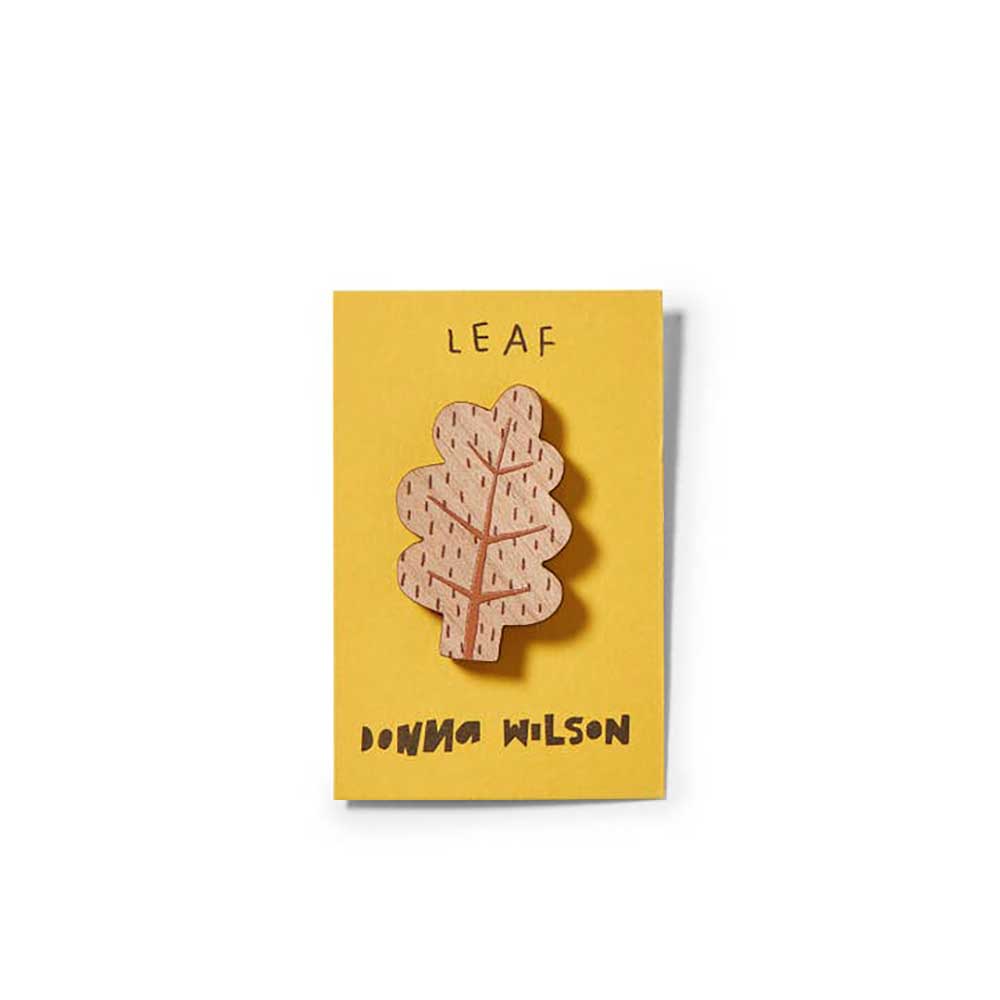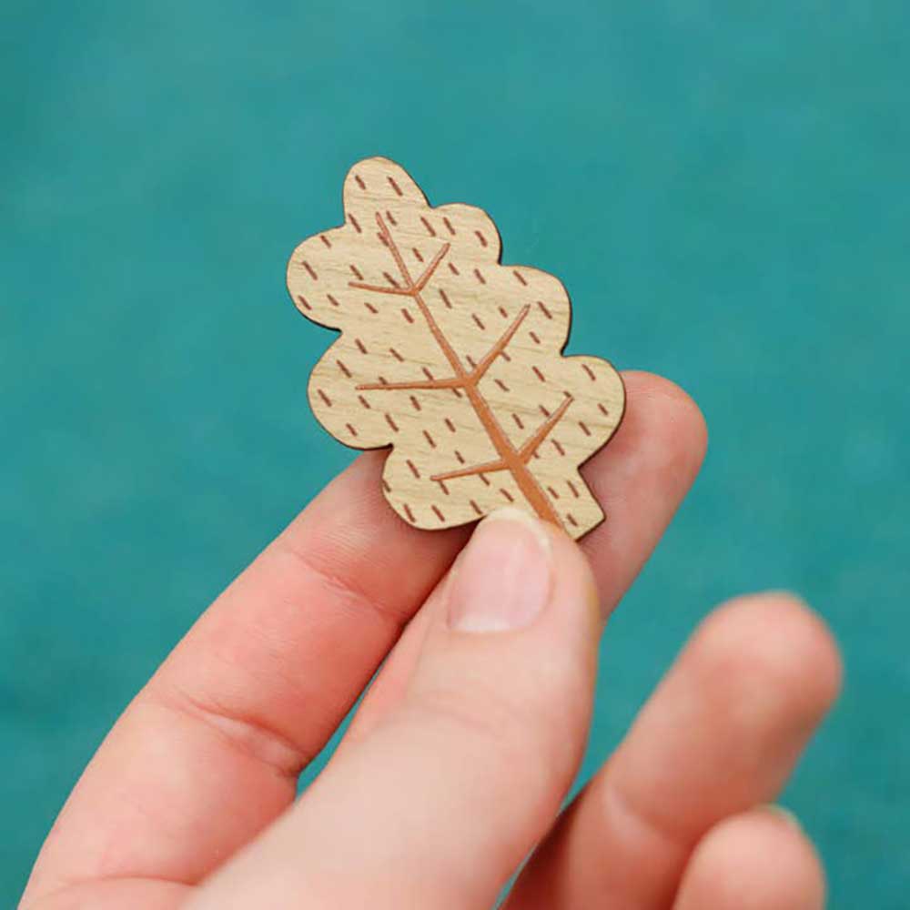 A printed wooden pin badge featuring a magnificent oak leaf.