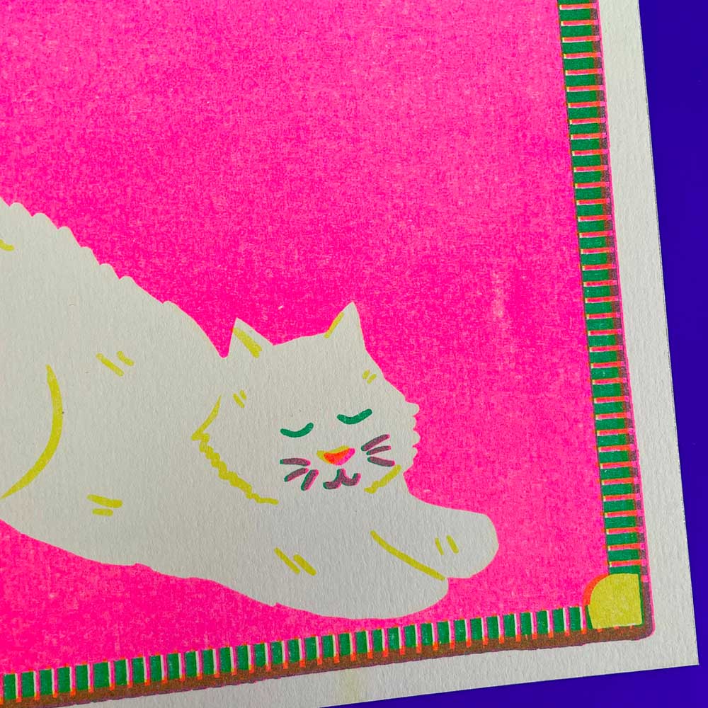 Risograph print featuring an cat doing a BIG STRETCH printed in the using soy based environmentally friendly inks on recycled paper stock